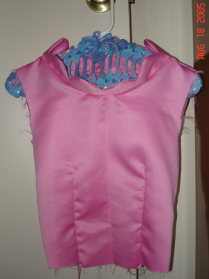 Week of August 7: I started working on a sample bodice out of crummy fabric for my Peach dress. By lengthening the original bodice pattern (the bridesmaid dress initially had an empire waist), I ran into a few areas that will need tweaking. I will need to bring the sides of the bodice pieces out further because of the lengthened darts. I also need to fine-tune the neckline to look smooth. I've figured out how to make the rounded parts of the collar - I will make the "bumps" out of two layers of pink fabric and one layer of fusible interfacing (so they stand up), and sew them in between the two layers (outside and lining) of the bodice at the neckline. Essentially I'll make them as I did the leaves of the Veggie. Sounds great in theory, but we'll have to see if it really works. At least I have extra fabric if it doesn't. I found some dark pink sheer fabric in the remnants bin at Jo-Anns, but I'm not sure what I'll do with it. It matches my dark pink fabric exactly. I've been working on my bodice, but I'll have to rethink the neckline idea (my original plan didn't work). Week of August 14: I finished up the top layer of the bodice, and my modifications seem to have worked fine. I taped pieces of notebook paper to the actual pattern pieces to get the complete shape I need, and my patterns have turned out. I need to make another bodice just like this one to use for the lining. But before I do that, I need to add the collar to the dress (so it's sewed in between the two layers). I decided to use a long strip of fabric around the entire neckline for the scalloped collar. I made a pattern out of notebook paper and used my last remaining pink scraps to make the collar (about 25 1/2" long, and 3" tall at the peaks). The collar was made out of two layers of pink fabric (I just barely had enough) and one layer of fusible interfacing (a scrap left over from another project). I sewed it to the dress, and it looks great - there are four "bumps" on either side of the center. There's just one problem - when I tried it on with the necklace, the invisible cord pulled down on the front of the collar. This isn't going to work. I am considering sewing thread "loops" along the seam between the bodice and collar, and threading the invisible cord through these loops. If my invisible cord doesn't work, I may need to get some pink ribbon instead. It looks like I'll need to integrate the necklace with the bodice if this is going to look good. I have now used up almost all of my light pink fabric.