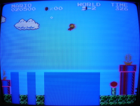 However, there is a much simpler way to see this quirk of the Mario universe. Type in the Game Genie code SZLIVO. This was initially the third part of a 3-part code to make Mario "always stay big". One of my elementary school friends showed me this as a way to save room for more codes. After you input this code, get a Mushroom. If you get hit, Mario will become small. Get hit again, and you'll grow to Super size. The best part of this trick occurs when you have Fire Flower power. Get a Fire Flower, then get hit. You'll shrink to mini-sized but with the fiery colors. Regardless of your powered-up status, tiny-sized Mario won't be able to break bricks. When you shoot a fireball, small fiery Mario will temporarily "pop up" to full size but only as he spits the fireball. Try it and see!