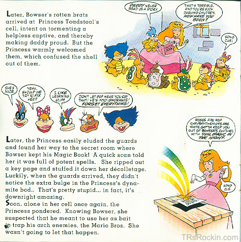 I honestly don't know what this CD is all about. I found this in a secondhand CD shop years ago, mixed in the soundtracks section. This is a double-feature: part Mario comic book and part music CD - and the cover artwork has nothing to do with either. If anyone knows the origins of this odd CD, please let me know. Interestingly, the comic was done by Voyager Communications, the parent comany of Valiant, who were the same folks who did the Nintendo Comics System. The story is based loosely on Super Mario World. Mario, Luigi, and the Princess are vacationing on Dinosaur Island, and the Princess is taken by Bowser. The Bros. meet with Yoshi who joins their quest to rescue her. Except that this storyline gets a bit more involved than "stomp a Goomba, eat a berry, hit a block" - we learn that Bowser's plans for world domination (or whatever it is he's always up to) involve turning all of Dinosaur Land into fossil fuels, then joining OPEC as an oil tycoon. The entire premise of this comic, by the way, is to promote literacy. Surely there are better ways to foster education than with a Mario mini-comic book. Long story short, Mario teaches Yoshi how to read, the Princess is saved because the illiterate Bowser left the instructions to a mechanical trap inside the trap itself, one of Bowser's kids turns against him, and everyone decides to be friends forever. Really. One last thing: the comic is peppered with "song cues", where I'm guessing you're supposed to load up the CD and listen to the appropriate song to follow along with the story. Just one problem - only one song (Ignorance is Bliss) actually has anything to do with the story. The rest of the songs are barely connected to the plot. There are some recognizable names among the artists on the album, but I'm not sure who they were trying to appeal to with this set. If I can be honest here, there aren't many redeeming features to this CD. The comic is mildly entertaining. "Ignorance is Bliss" is amusing in that it's sung by Bowser to "Princess Toadstool" (before she was known worldwide as "Peach"). As a whole package thought, I've only listened to the whole disc a few times. A note in the back of the comic explains that a portion of the proceeds from the sale of the album would go toward a children's literacy foundation. I don't know if these were sold at fundraisers or what, but the CD and comic combo seems pretty obscure. As far as I know, this is the only American Super Mario World comic ever released. I still don't get the cover artwork for the disc. There's no indication on the front or back covers that there's a comic inside, so it was definitely a nice surprise once I bought the disc. Is this worth looking for? Unless you're a Mario collector, probably not (unless you really want to hear Bowser's singing). Comic Scans (click to open full-sized image in a new window) Ignorance is Bliss - Lyrics Wake up! Ms. Toadstool Princess Toadstool Oh well, I hate to be a bummer Princess Toadstool With my magic book I'll shower Princess Toadstool Haven't you heard, a picture's worth a thousand words You call yourself a princess, but you're a brainiac in a dress I'd like to get my hands Princess Toadstool Princess Toadstool For the last time... On second thought, I think I've made my point Track Listing